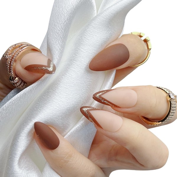• Fashion Meets Elegance: Step into the spotlight with these Almond chocolate matte french tip nails, flaunting a deep brown and nude base, paired with matching tips for a classic-meets-modern vibe. The pointed tips and matte finish are your new BFFs for any event. From power suits to white dresses, these nails step up your style game. A must for the fashion crew, designed to turn heads and step up your vibe