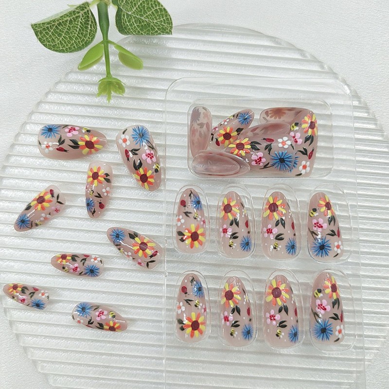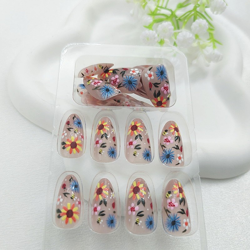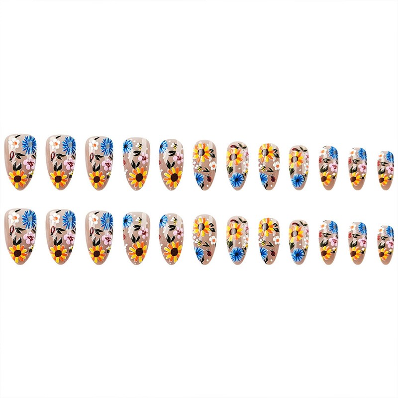 Press on Nails Almond Medium Fake Nails wite Floral Designs Cute Nails Press ons Spring Summer Acrylic Nails Glossy Glue on Nails Artificial False Nails Reusable Stick on Nails for Women 24 Pcs
