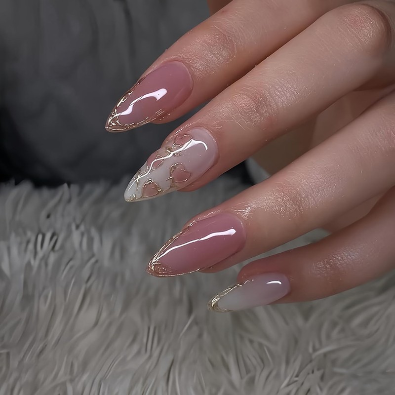 Press On Nails Almond Medium,Pink Fake Nails With French Tips And Gold Border Heart Glitter Design,Glossy Full Cover Acrylic Nails Press Ons Gold,Natural Reusable Glue On Nails Kit For Women