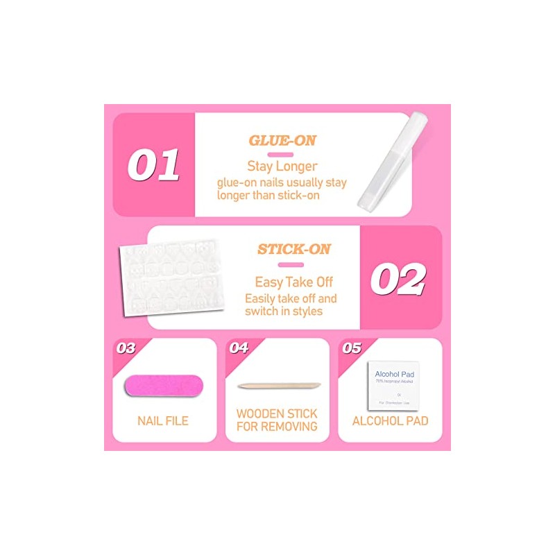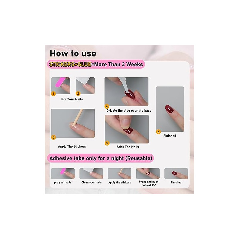 - Reusable 24 pieces press on nails medium length are durable to last for 2 weeks. Package inclues:24 Pcs Press on Nails, 1 Nail Glue, 1 Glue Sticker, 1 Wooden Stick and 1 Mini Nail File