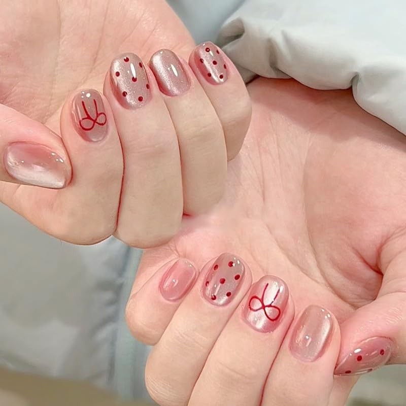 Press On Nails, Cat Eye‘s Beauty Pattern in Glue on Nails, Fake Nails, Stick On Nails, Short Almond Square Shape on 24PCS (Red Bow)