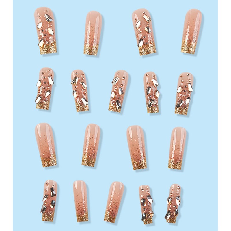 - Y2K French Long Square Nails - Semi-Transparent nude is presented on the finger and gold glitter towards the tips. Moreover, enhanced with 10 luxurious 3D gold rhinestones. Mix and match to create your unique style that perfectly complements every outfit, ranging from the everyday chic to the glamorous party looks