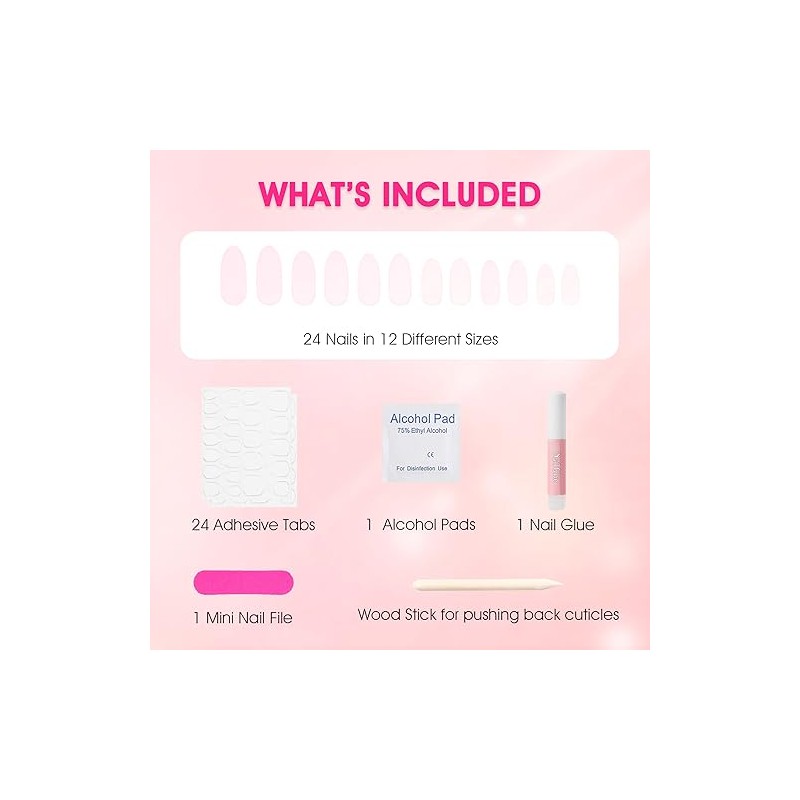 24PCS acrylic nails, nail glue, adhesive tabs, a double-sided nail file, a cuticle stick, and a prep pad