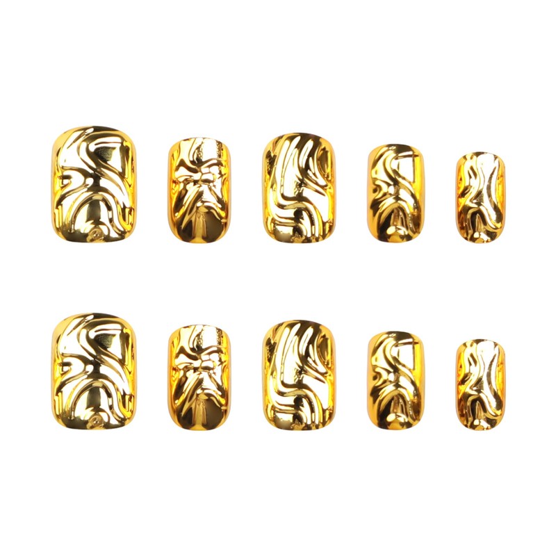 Press On Nails, Gold Foil Glitter Designed in Glue on Nails, Golden Line Fake Nails, Short Square Almond Ballet Shape for Stick On Nails on 24PCS (Short 3D Gold)