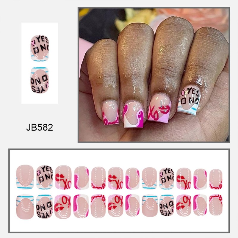 Press on Nails Letter Red Lips French Tip Fake Nails Short Square Glue on Nails Romantic Acrylic Stick on Nails for Women