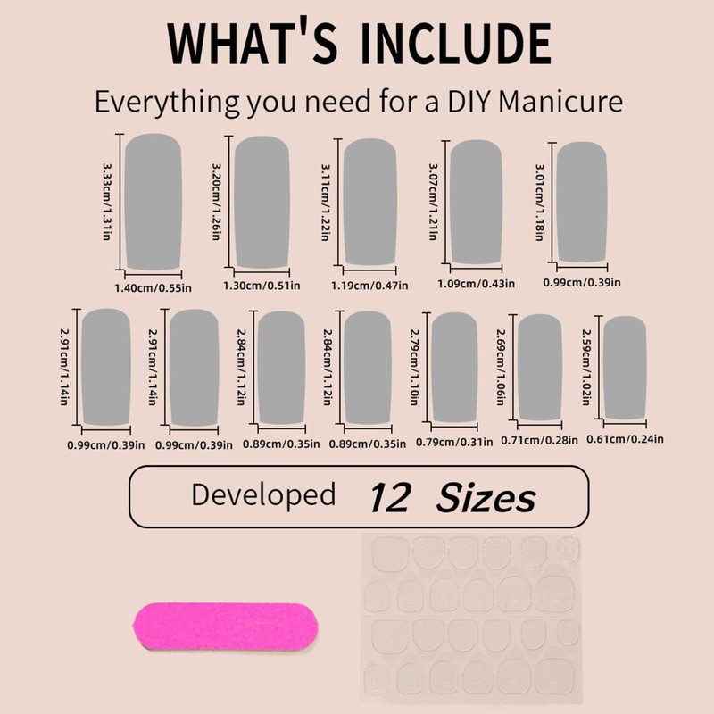 - Package includes: 24 pcs long square press on nails, 24 pcs jelly glue stickers, 1 nail file, 1 wooden stick, 1 alcohol pad, the fake nails are available in 12 different sizes, so it is convenient for you to choose the one that fits your nails