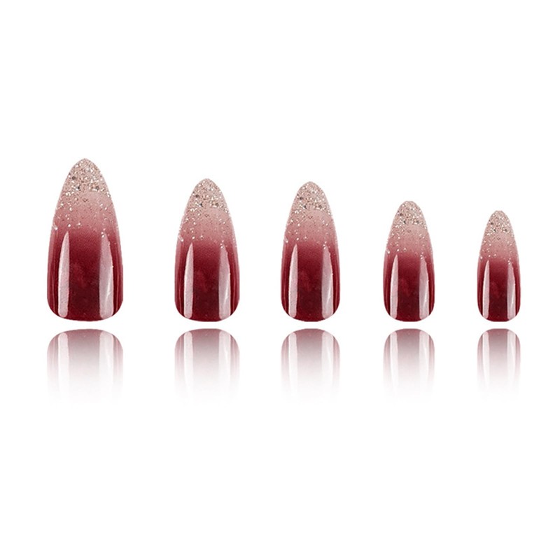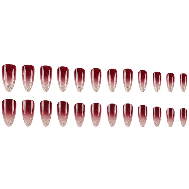 Press on Nails Medium Almond Fake Nails Glitter Gradient Acrylic Nails Wine Red Ombre False Nails Glossy Artificial Nails Glue on Nails for Women Manicure Nails Decoration 24Pcs