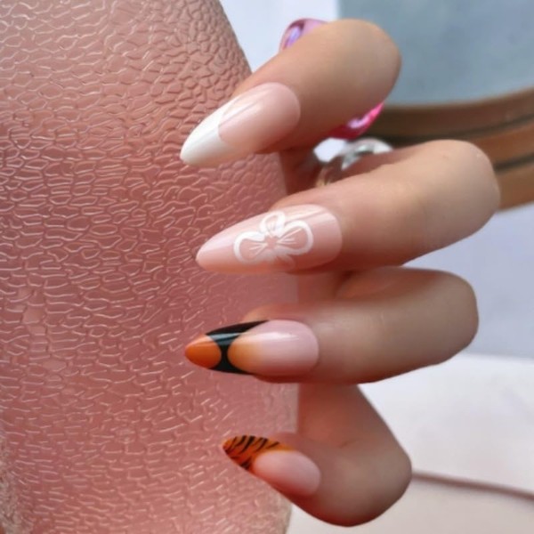 Press on Nails Medium Almond Fake Nails Glossy Glue on Nails Brown Leopard Print Zebra Print Design Acrylic Nails Stiletto Artificial Nails French Tip Stick on False Nails with Flower Design 24 PCS