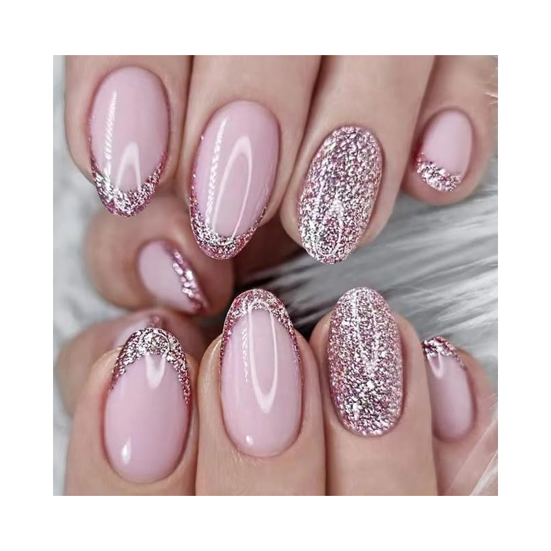 Press on Nails Medium Almond, LY LANYOS Acrylic Nails Press on Fake Nails with Glue,Gel Acrylic False Nail for Women Girls in 24 PCS (Pink Glitter)
