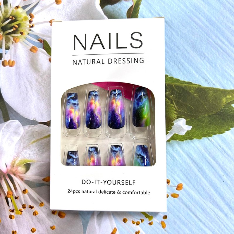 - Press on Nails Package: You'll get 1 box 24 pieces false nails. 1 mini nail file, 1 small wooden stick, 1 piece of nail glue sticker
