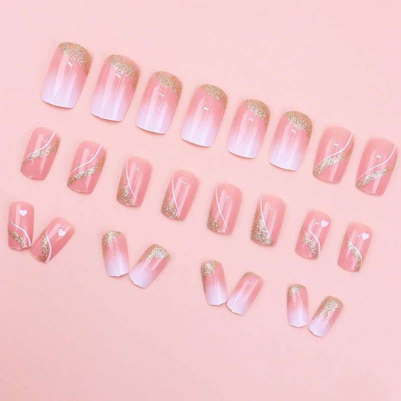 Press on Nails Medium Square Fake Nails Gold Glitter False Nails with Design Heart Curve Glue on Nails Gradient Pink Full Cover Acrylic Stick on Nails Reusable Artificial Nails for Women Manicure Kit