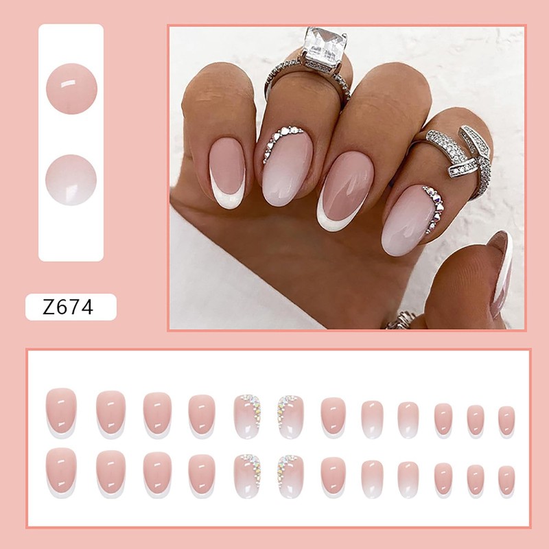Press on Nails Oval French Tip 24Pcs Glossy Full Cover Medium Acrylic False Nails with Rhinestone Designs Natural Artificial Fake Nails Set with Glue Stick on Fingernails for Women Girls