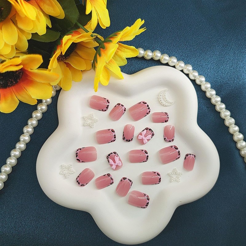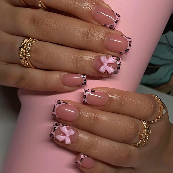 Press on Nails Short Square Fake Nails with 3D Bow Designs Leopard French Tip Nails Press ons Glossy Glue on Nails Nude Acrylic Nails Spring False Nails Summer Stick on Nails for Women 24Pcs