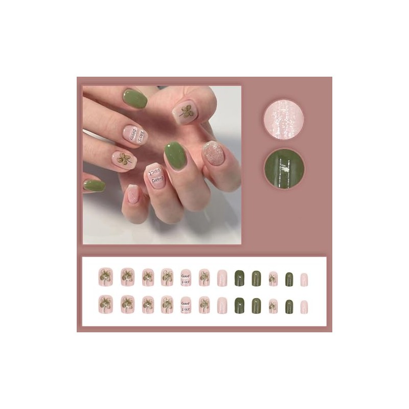Press on Nails with Four Leaf Clover Short Square Good Luck Design Nails Full Cover Reusable False Nail Kit 24pcs
