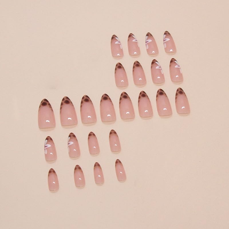 Press On Nails with Nail Glue, 3D Peach Flower Summer Cute Designed in Glue on Nails, Fake Nails, Short Square Almond Ballet Shape for Stick On Nails on 24PCS,Leopard White Flower