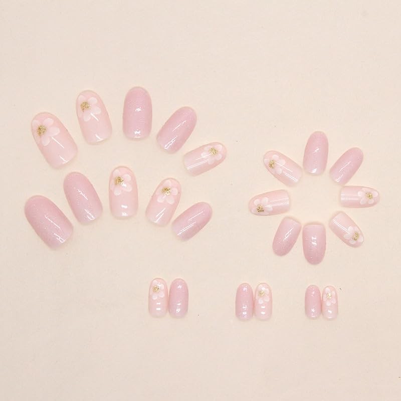 Press On Nails with Nail Glue, 3D Peach Flower Summer Cute Designed in Glue on Nails, Fake Nails, Short Square Almond Ballet Shape for Stick On Nails on 24PCS,Pink Glitter Flower