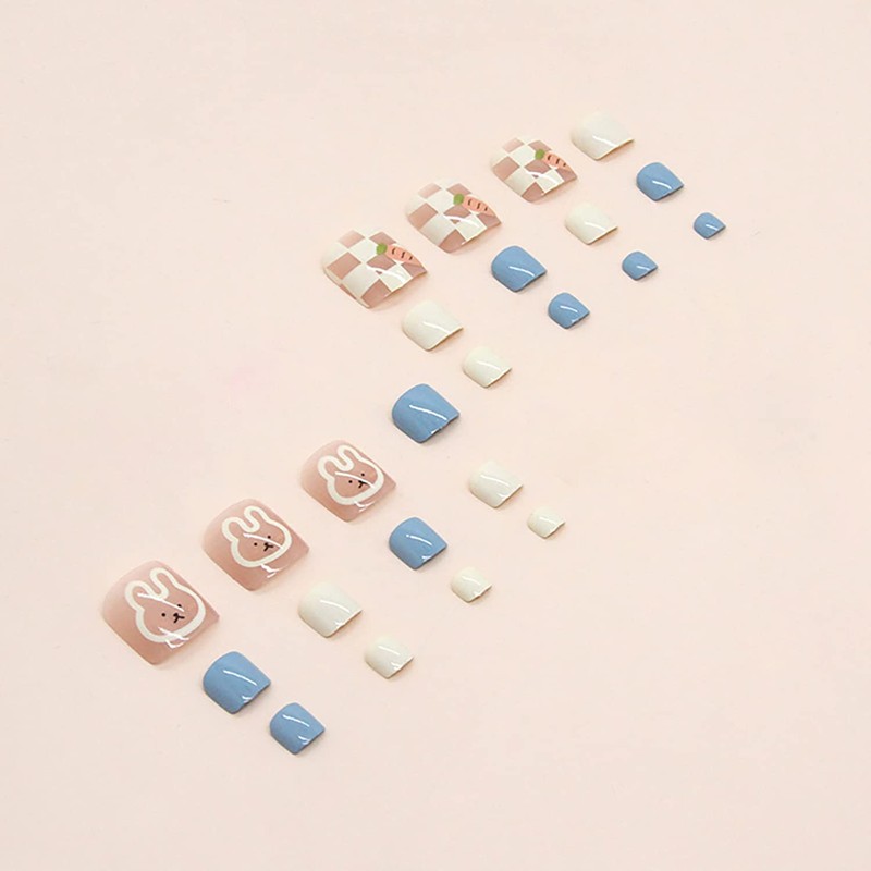Press on Toenails with Rabbit Designs, 24 Pcs Cute Square Full Cover Glossy Reusable False Toe Nails with Glue, Coffin Artificial Acrylic Fake Nails Glue on Toenails Short Stick on Toe Nails for Women
