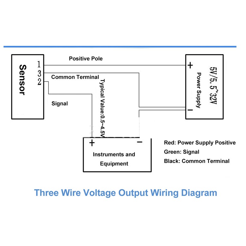 Wiring: Red Positive for 5V. Black for ground. Green or blue for signal output.