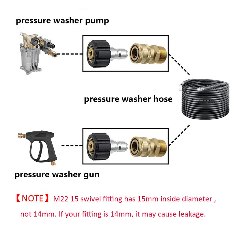 - 【Warm Tips】This adapter kit is only compatible with M22-15mm and 3/8" quick-connect fittings on high-pressure washers, so it is suitable for Sun Joe, AR Blue, Stanley, Campbell, MI-T-M, Cleanforce, Simoniz.(If your fitting is 14mm, it may cause leakage.)