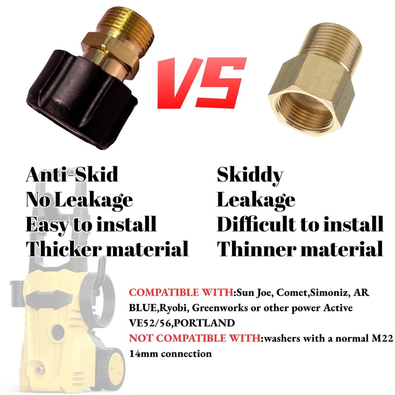 ATTENTION: CONVERT METRIC M22 15MM FEMALE TO M22 14MM MALE. M22 14mm fitting is compatible with Generac, Simpson, Briggs Stratton, craftsman, karcher, Ryobi pressure washer. M22 15mm fitting is compatible with Sun Joe, Campbell, MI-T-M, AR Blue, Stanley, Cleanforce, Simoniz, Excell power washer. Materials: The pressure washer hose adapter is made of high quality aluminum with a special anti-corrosion treatment on the surface, which will not wobble or leak, and is stronger and more durable than other untreated adapters.Pressure washer hose adapter with high quality brass construction and durable Nylon forged housing, wear resistantand, resistance to corrosion, Strong in construction ensures long life. Easy to use: Anti-slip cover design for easy connection. Good metric threading process ensures smooth installation without jamming. Pressure washer fittings connect the pump outlet to the pressure washer hose or the pressure cleaning hose to the gun. Count on pressure washer fittings to stop leaks and make cleaning easy. Clean your boat, clear dirt from your deck, or power wash your patio and siding. The pressure washer coupler allows your new M22 14mm pressure hose to attach to M22 15mm pressure washer's output port to do dozens of projects. Pressure washer coupler connects power washer gun to hose, hose to pump.If leakage, please put teflon tape on the male threads of your wand or other products.please free to contact us if any questions.