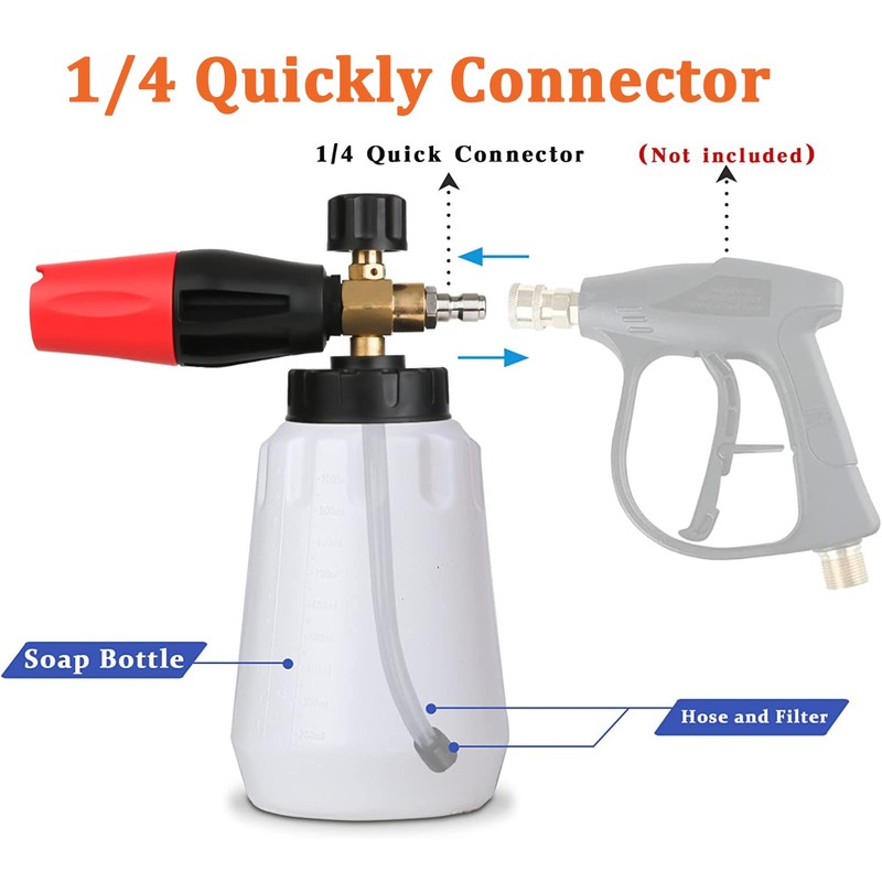 - 【Easy to Install】: Foam cannon come with 3 parts, need to assemble by yourself. Fill some soap into the bottle with warm water to get thick foam; Then connect 1/4" quick connection plug to Pressure Washer Gun or Wand. Finally, adjust the knob on the top to desired foam level and then foam sprayer will disperse thick foam.