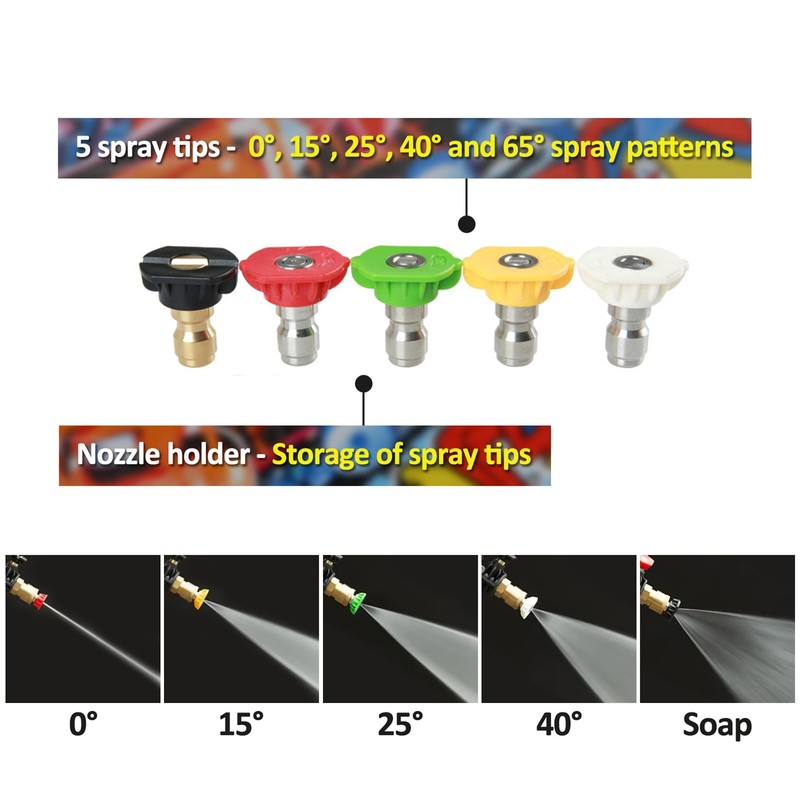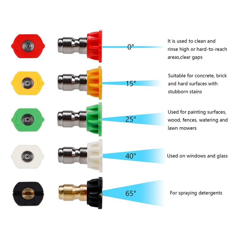 - Complete set: Pressure Washer Tips contains 1 Black Brass soap nozzle,1 Red Stainless Steel Nozzle Tip (0 Degree),1 Yellow Stainless Steel Nozzle Tip (15 Degree),1 Green Stainless Steel Nozzle Tip (25 Degree),1 White Stainless Steel Nozzle Tip (40 Degree).Choose different angles nozzle according to the actual need.
