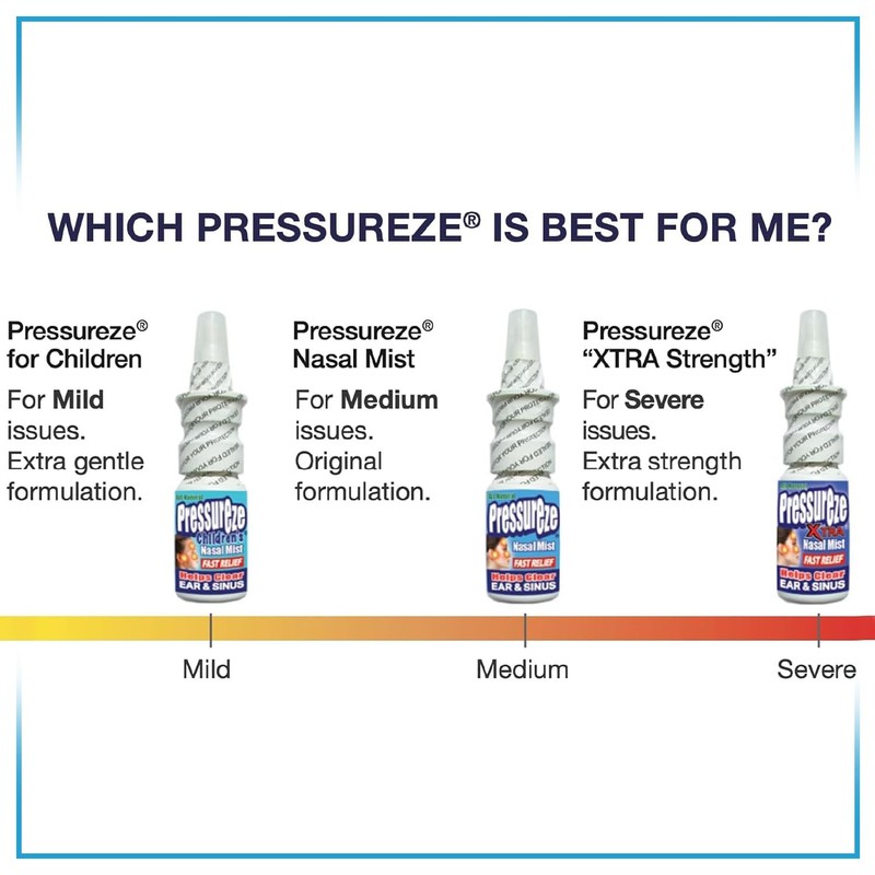 - XTRA STRENGTH: Xtra Strength for chronic ear and sinus symptoms. Works to quickly help alleviate sinus congestion, nasal drip, and loud snoring due to congestion. Make sure to always use Pressureze 30 minutes prior to flying, diving, and swimming.