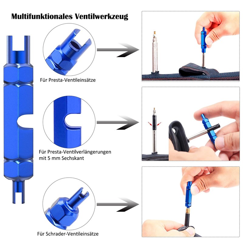 In addition, a plastic tool makes it easy to quickly remove Presta valves - without much effort and particularly practical for on the go or in case of breakdowns.