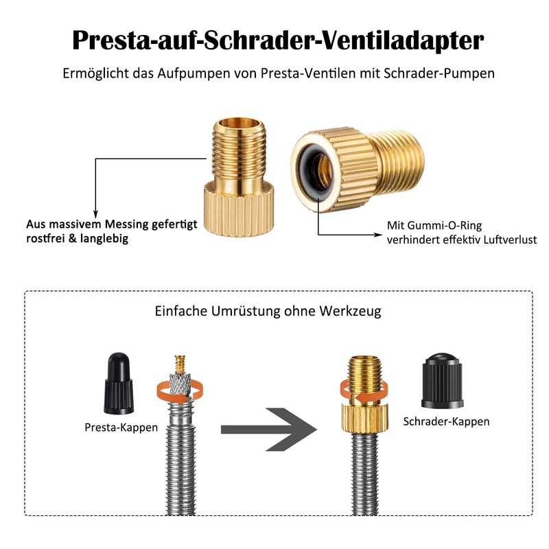 • Flexible & Compatible: With the included adapters, Presta valves can be easily converted into Schrader valves - perfect for standard air pumps or compressors. Ideal for road bikes, mountain bikes, city bikes and e-bikes.