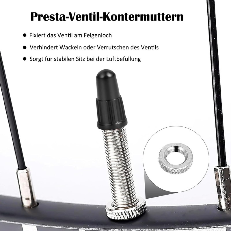 6 locking nuts for Presta valves ensure that the insert is stable and does not loosen when driving - for maximum safety. The 8 valve caps (6 x Presta, 2 x Schrader) reliably protect your valves from dust, dirt and moisture and significantly extend their service life.