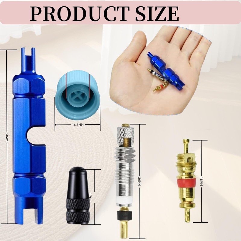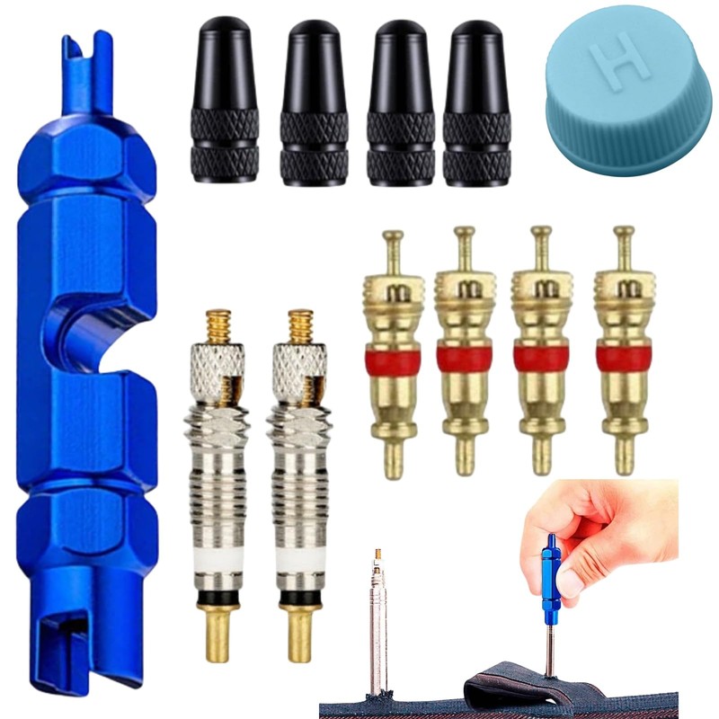 - Package includes: our valve core set contains 2 x French valve (insert), 4 x pure copper valve cores, 4 x valve caps, 1 x blue valve core removal tool, 1 x blue replacement valve caps for car air conditioning systems