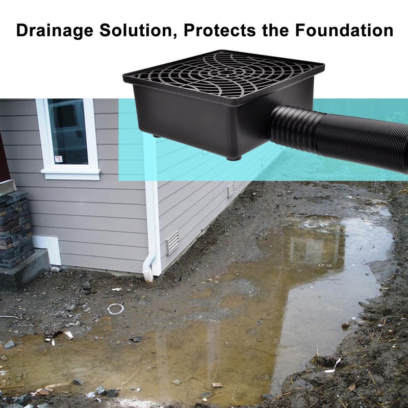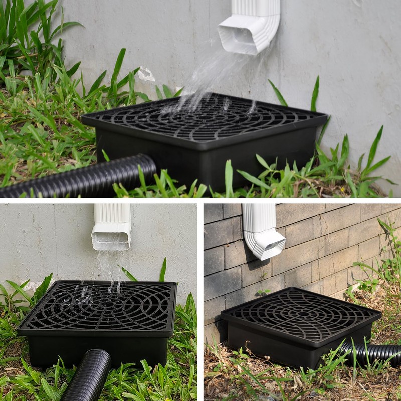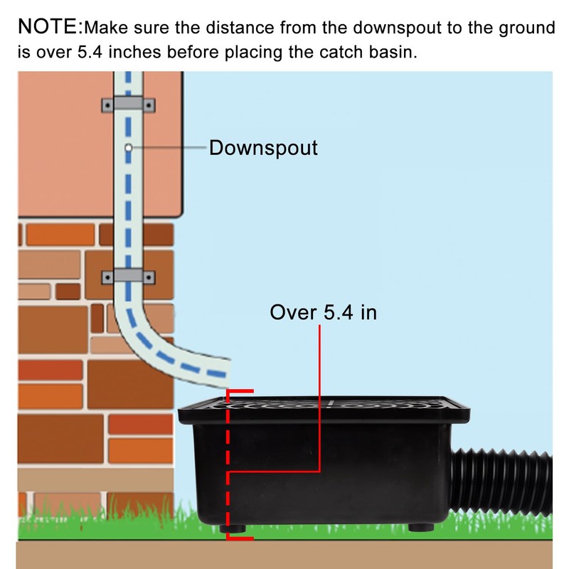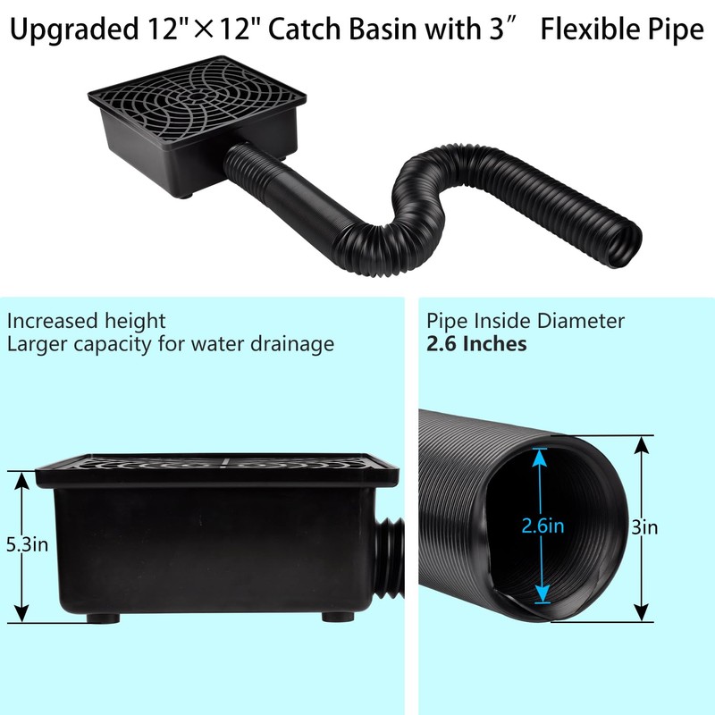 - Upgraded Version Catch Basin. Basin size: 12”×12”×5.3”(LWH). Higher than the old version. Larger spout to connect with 3” pipe. There is no need to connect to the downspout. Able to route the water in another direction so the water won’t flood the open patio