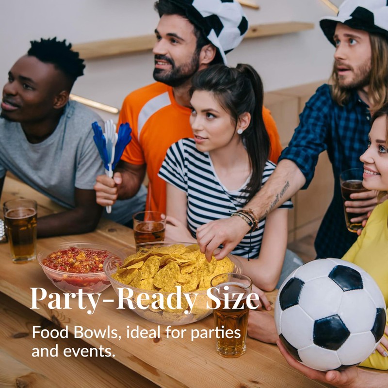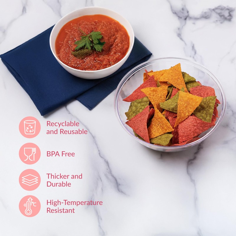 - High-Quality Party Bowls: These premium bowls are made from a high quality clear plastic that lends them a sleek look. They’re made from a durable polystyrene plastic that makes them suitable for cold and hot foods.