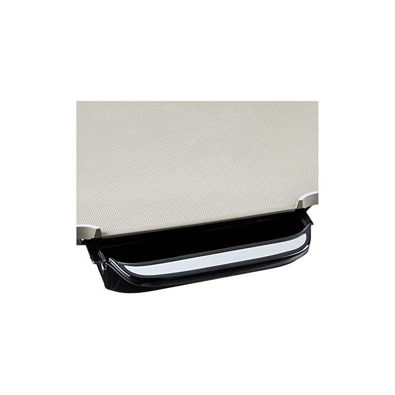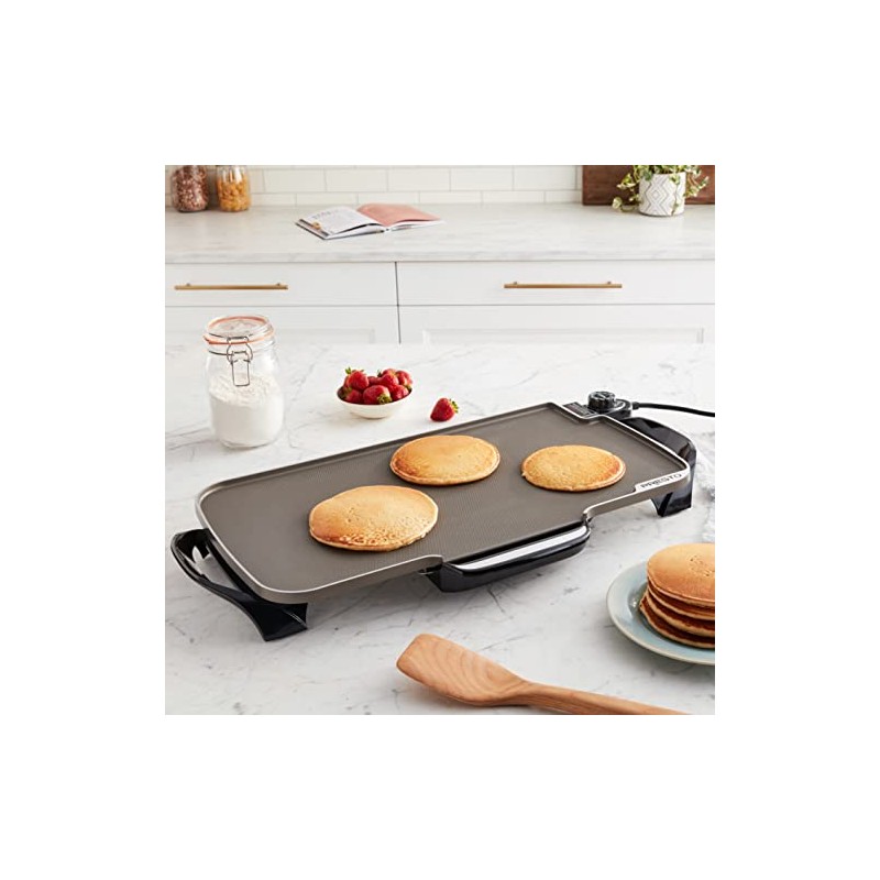 This extra-large 22-inch griddle makes enough food for the entire family and still stores neatly in the kitchen cabinet. A special textured ceramic cooking surface provides enhanced nonstick performance and easier cleaning for breakfast, lunch, dinner, and entertaining. Removable handles make it simple to clean and compact to store. Simply open the latch clips to detach handles from base. With the handles removed, the griddle stores efficiently in most standard 18-inch kitchen cabinets. Control master heat control automatically maintains the desired cooking temperature. The heavy cast aluminum griddle is virtually warp-proof. Slide-out drip tray removes for quick cleanups, and griddle is fully immersible with the heat control detached.
