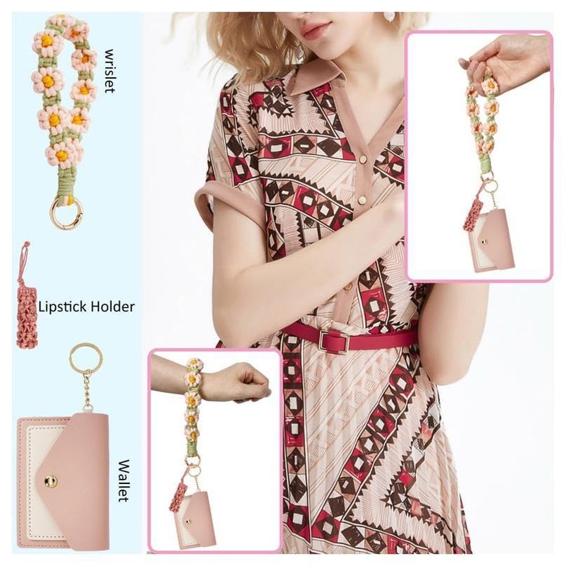 Pretaco Pink 3-in-1 Bohemian Hand-Woven Flower Keychain Bracelet Pendant Phone Chain + Card Organizer + Lipstick Woven Mesh Pocket