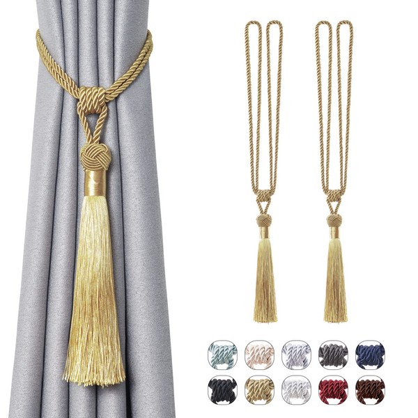 Pretty Jolly 2 Pack Long Tassel Curtain Tiebacks Handmade Braided Rope Knot Drape Tie Backs European Style Decorative Curtain Holdbacks for Home & Office Window Drapery (Gold)