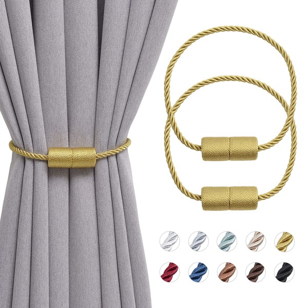 Pretty Jolly 2 Pack Magnetic Curtain Tiebacks 16 Inch Handmade Weave Side Rope Curtain Holdbacks Convenient Decorative Cylinder Curtain Drape Tie Backs for Home & Office Window Drapery (Gold)