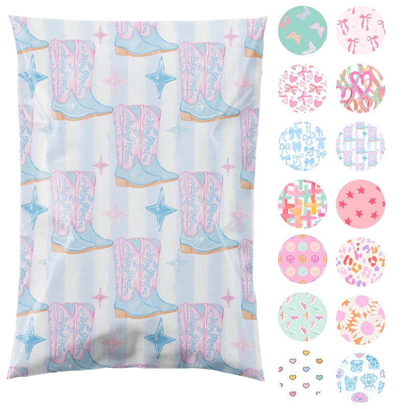 Pretty Package Store 14.5x19 Designer Poly Mailer 100 Pack Heavy Duty Waterproof Self Seal Shipping Bags for Small Business Large Mailing Envelopes Bulk Tear Resistant Packaging Cowgirl Boots Western