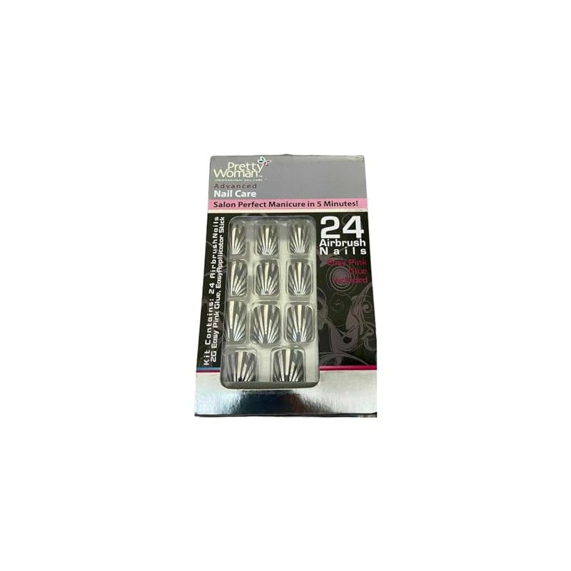 Pretty Woman Airbrush Nails – Silver with Black Stripe | Salon Perfect Manicure in 5 Minutes | 24 Nails with Pink Glue & Applicator Stick Included
