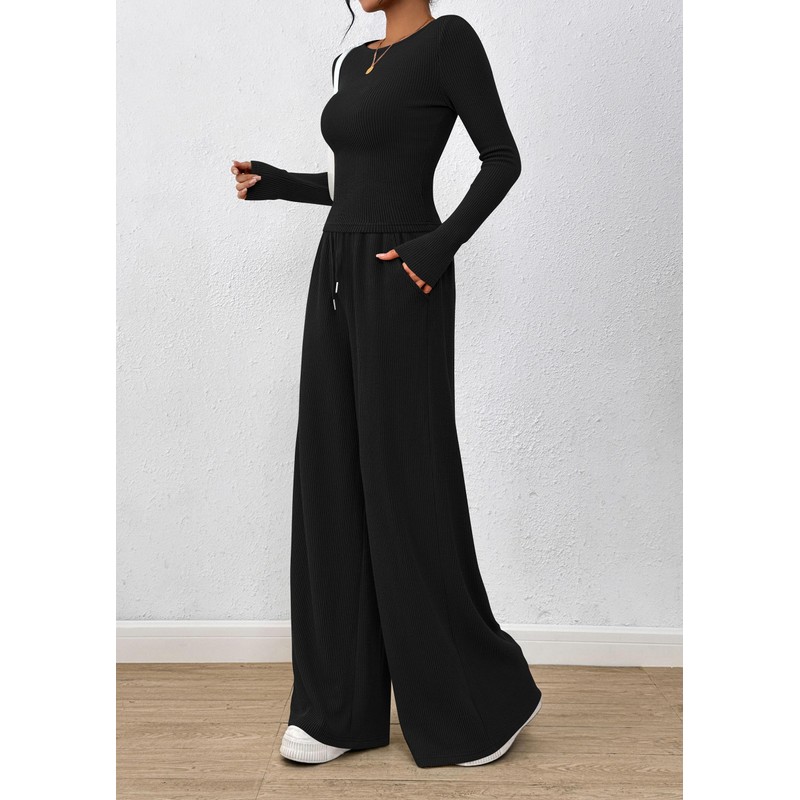 - Features: Top: Boat neck, long sleeve, Pants: Elastic waistband, high waist, pull-on style, wide-leg design, with pockets. Lounge sets can be worn as a set, or as separates. Effortless cozy and chic designs for a laidback