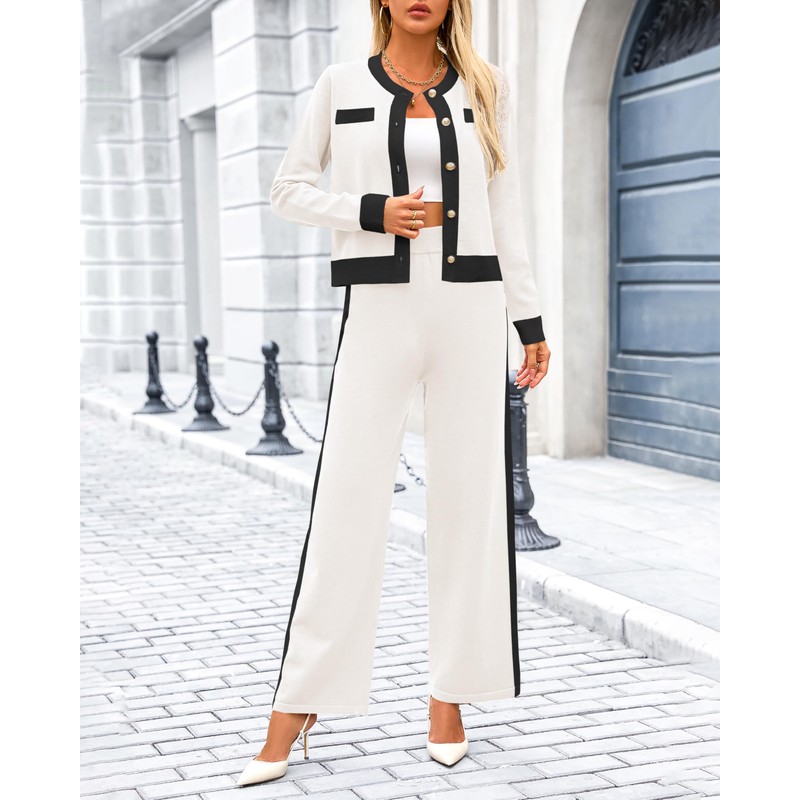 Unique Design: Long Sleeve Button Down Color Block Cardigan Wide Leg Pants Sweater Sets