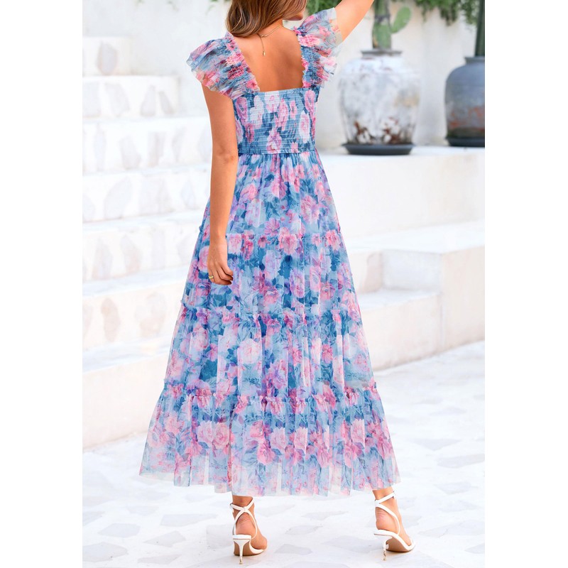 - CHIC FEATURES: This Summer Sundress Features A Delicate Tulle Fabric with Lining, Adding A Touch of Elegance and Femininity to Your Outfit. Women Long Flowy Dress Features A Smocked Design, Bringing Both Style and Comfort, Creating An Hourglass Shape and Highlighting Your Natural Curves. Casual Midi Dress with Delightful Frill Layers That Adds A Playful Touch to Your Look, Creating A Flouncy and Charming Appearance