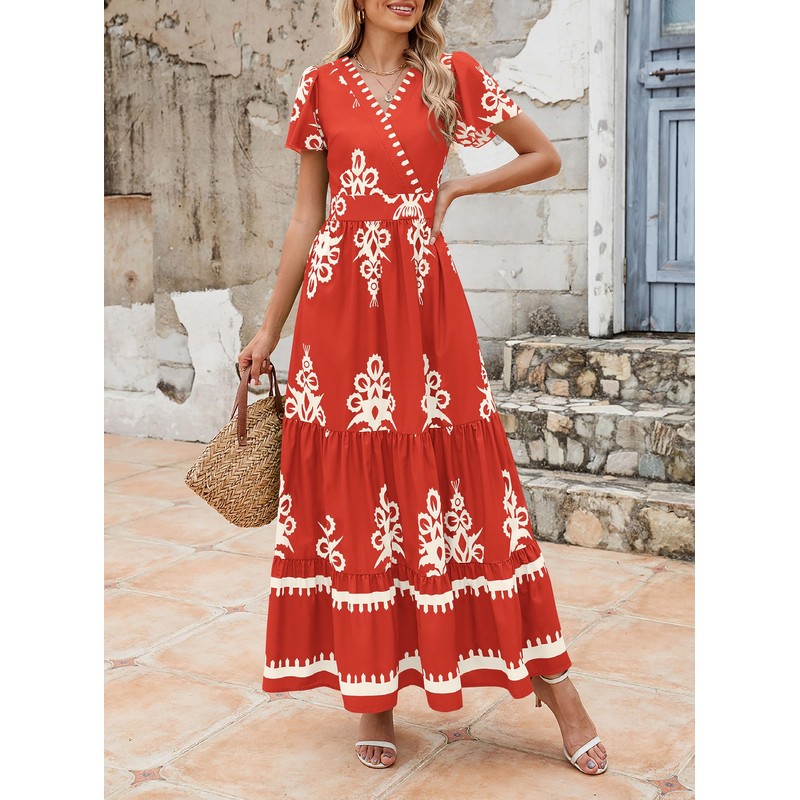 - DESIGN FEATURES:Short Sleeve Maxi Dress for Women;Floral Dress for Women;Boho Dress for Women;Flowy Dresses for Women;Womens Bell Sleeve Dress;A Line Dresses for Women;Tiered V-Neck Dress for Women;Party Dresses for Women;Pleated Dress for Women