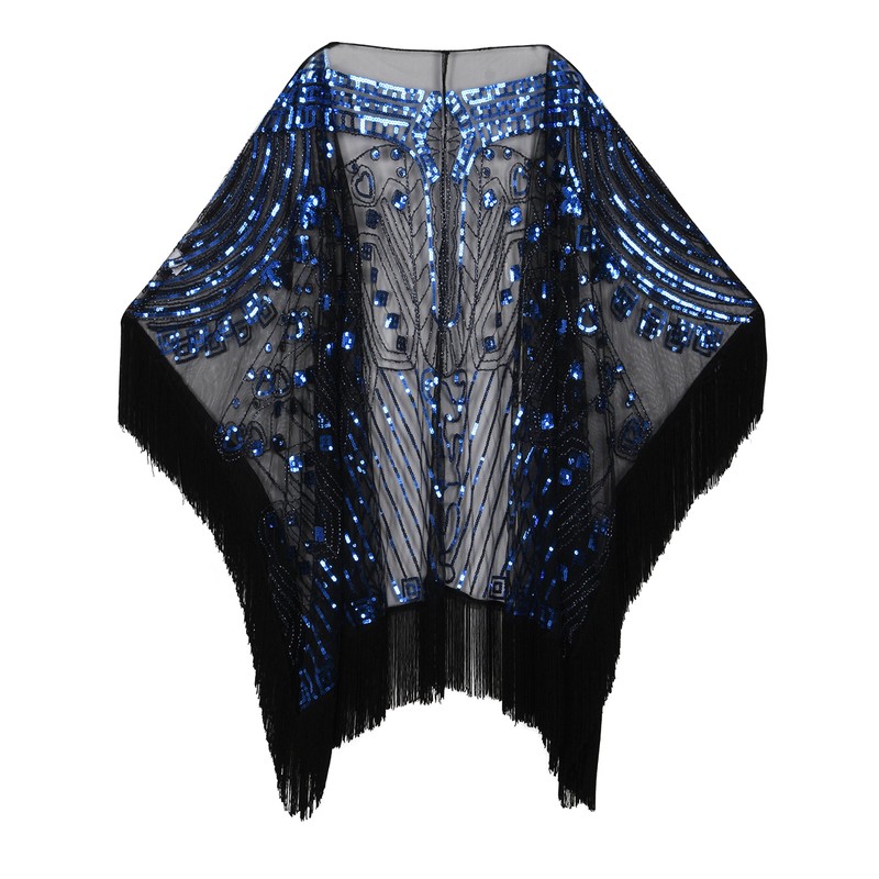 PrettyGuide Women's 1920s Shawls and Wraps for Evening Dresses Oversized Sequin Beaded Fringed Wedding Cape, Black Blue, One Size
