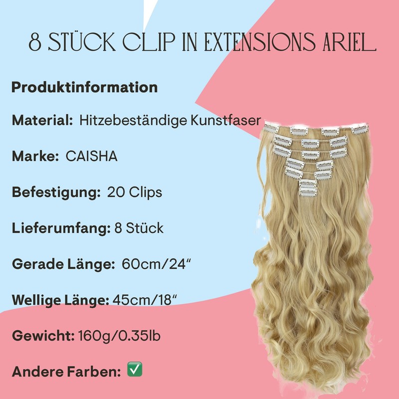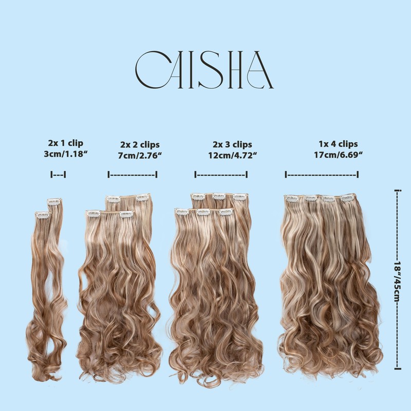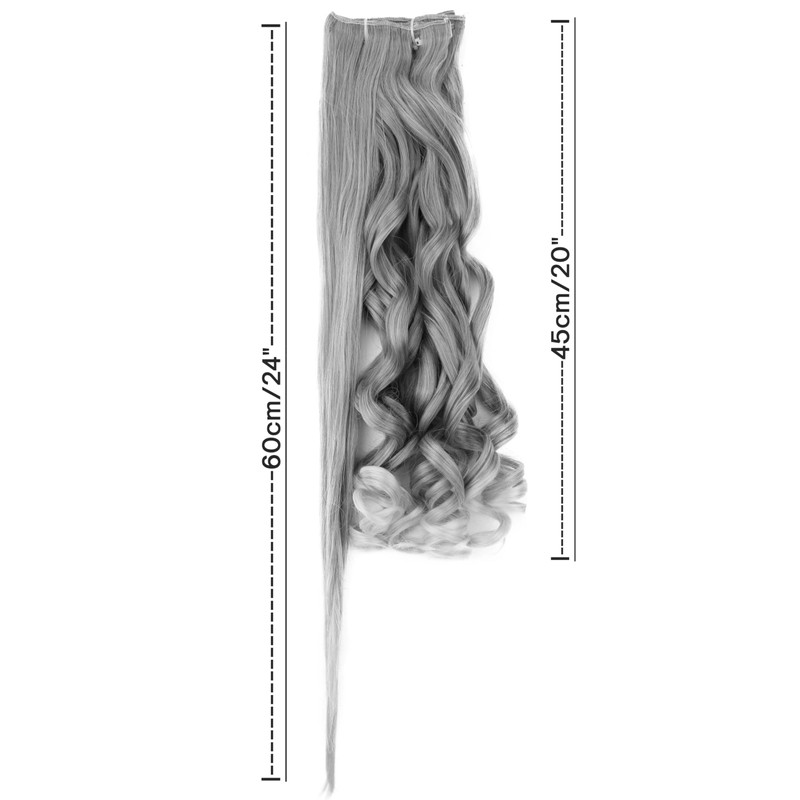 - 8-piece set with clips. 20 clips, 60 cm long in smooth condition and 130 g without clips: 2 wefts each approx. 3 cm with 1 clip each, 2 wefts approx. 7 cm with 2 clips each; 2 wefts approx. 12 cm each with 3 clips each; 2 wefts approx. 17 cm each with 4 clips.