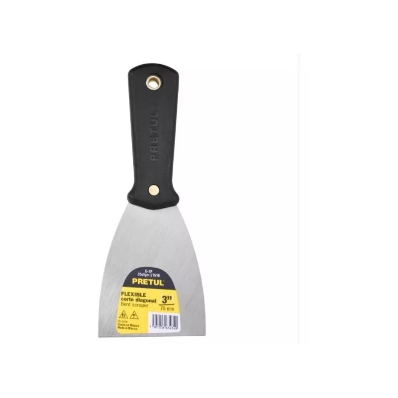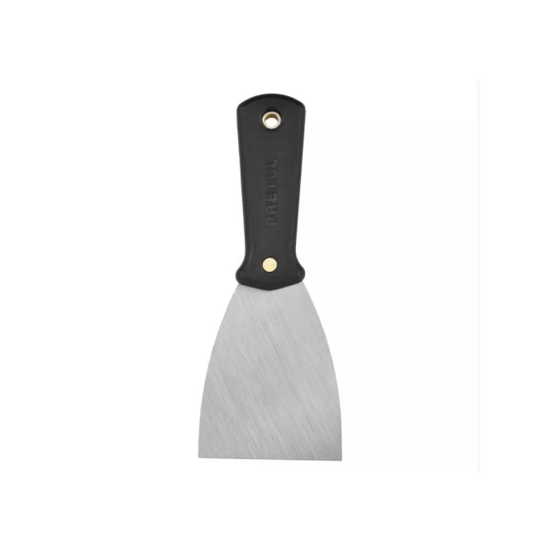 Espátula rígida de 3 pulgadas Pretul, permite resanar y aplicar diferentes materiales durante trabajos de construcción o remodelación. Cuenta con una hoja de acero resistente y mango de plástico para facilitar su manejo. Tiene un orificio en la parte superior para colgarla y almacenarla fácilmente en el taller o el hogar. Su diseño con borde de corte diagonal es apto para eliminar impurezas de cualquier superficie.