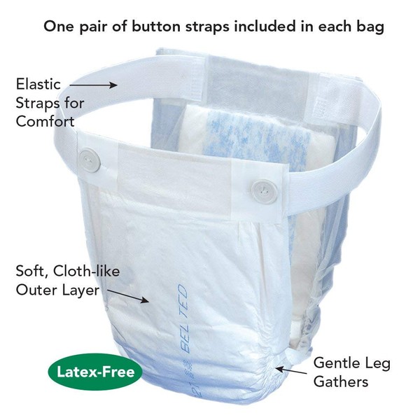 For loss of bladder control. Soft, stay-dry top sheet: Fluids absorbed quickly for greater comfort and reduced skin irritation. Secure: Elastic belts provide a snug fit. Quiet: Moisture barrier prevents leaks and reduces noise. Reinforced buttonhole. Multi-Strand Elastic Leg Gather: Gently gather to prevent leakage, Made in USA.