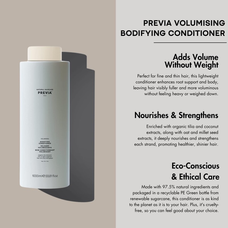 PREVIA Volumising Bodifying Conditioner | Adds Volume & Moisture for Fine Hairb | Vegan Natural Ingredients | Organic Tilia & Coconut Extract | Sustainable Packaging | 33.8 oz