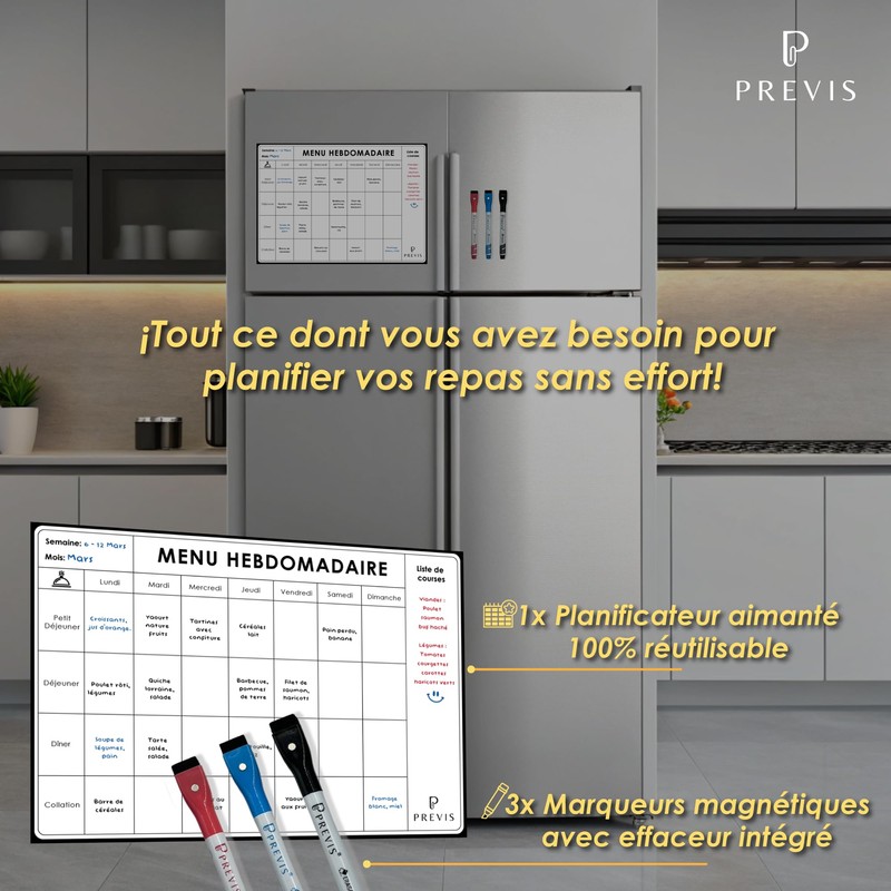 • Organize Vos Hebdommadaires SANS EFFORT Avec le PREVIS Planning Frigo magnetic, plan menus n'a jamais été aussi. Gagnez du temps et réduisez le stress quotidien in organisant tous vos repas — pe-déjeuner, dîner et collations — in a seul endroit visible for the toute of the family.