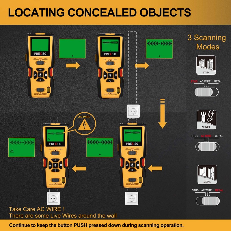 • 3 Scanner Features stud modes - PREXISO stud locator with multi-functions could quickly and easily locate wood studs metal pipes and live AC wires behind walls, floors, and ceilings; Scanner features stud modes with 3 depth types,detecting up to 1 inches deep in drywall; Metal mode could detect various metal materials deep up to 1-1/2 inches; and AC mode detects live AC wires up to 1-3/8 inches